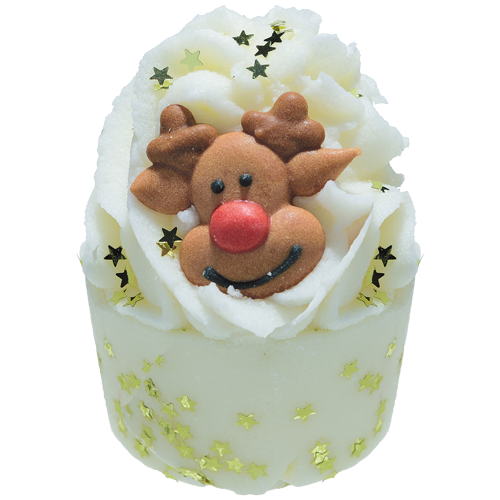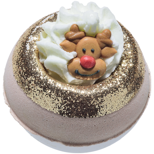 Piękny, czekoladowy renifer Rudolf z czerwonym noskiem spoczywa na kremowej piance z naturalnych masełek, kusząc słodkim aromatem pysznej, gorącej czekolady oraz niemałą porcją odświętnego brokatu!